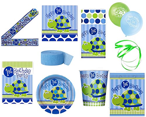 All images of Boys 1st Birthday Turtle Themed Party Supplies for 16 Guests This Ultimate Party Pack Includes Banner, Table Cover, Cups, Luncheon Napkins, Plates, Treat Bags, Invitations, Curling Ribbon, Streamer, and Balloons - This Bundle Includes 108 Pieces!